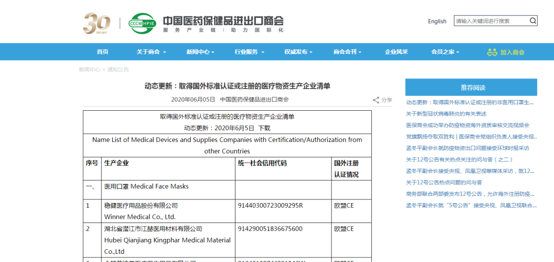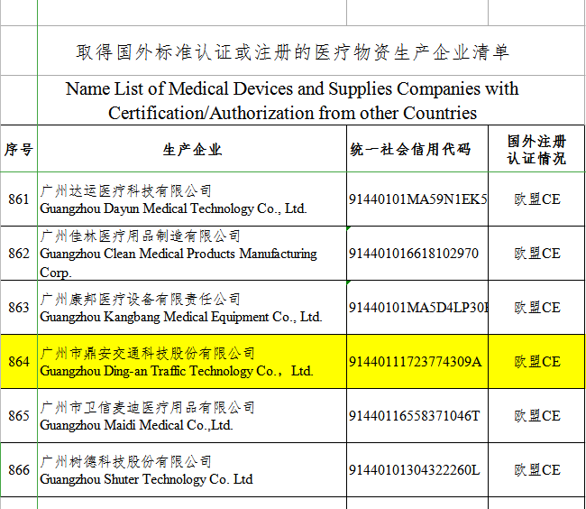 據悉,中國醫藥保健品進出口商會官網于6月5日再次更新了取得國外標準認證或注冊的醫療物資生產企業清單,廣州市鼎安交通科技股份有限公司名列其中,成功進入商務部醫療物資出口“白名單”!